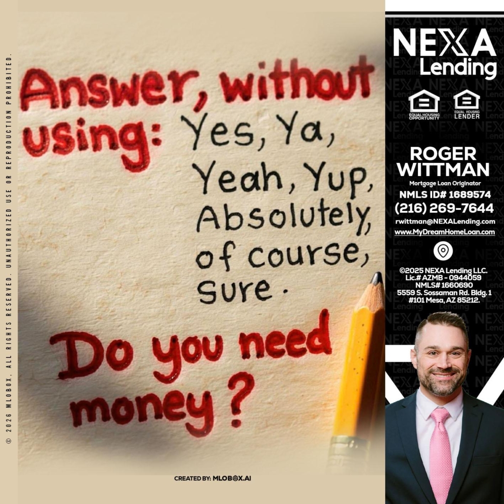 Hi, my name is Roger Wittman. I’m a Loan Officer with NEXA Lending LLC., offering personalized mortgage solutions, fast customized quotes, great rates and service with integrity.