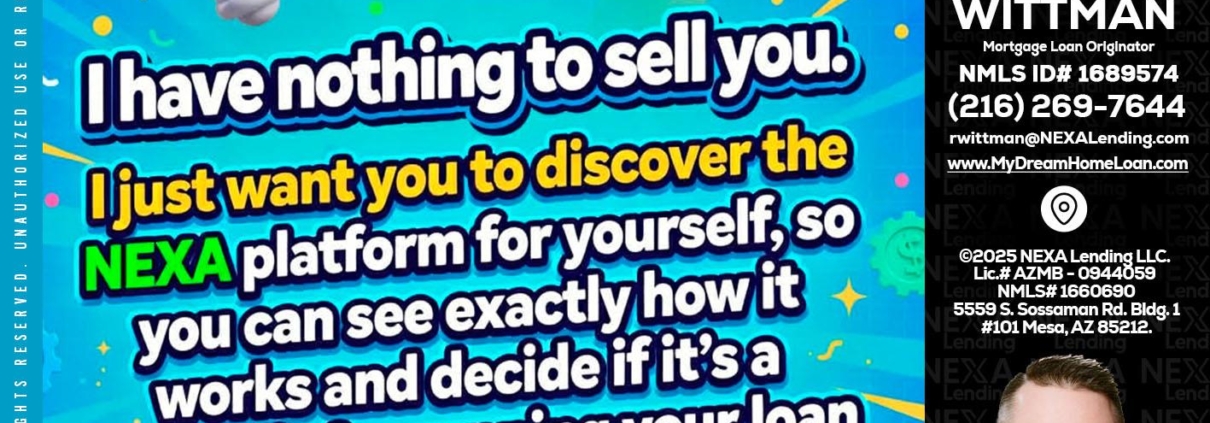 Hi, my name is Roger Wittman. I’m a Loan Officer with NEXA Lending LLC., offering personalized mortgage solutions, fast customized quotes, great rates and service with integrity.