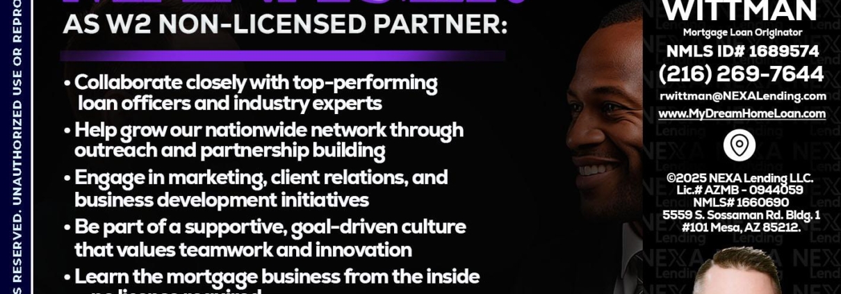 Hi, my name is Roger Wittman. I’m a Loan Officer with NEXA Mortgage LLC., offering personalized mortgage solutions, fast customized quotes, great rates and service with integrity.