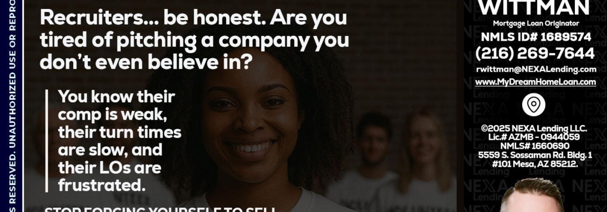 Hi, my name is Roger Wittman. I’m a Loan Officer with NEXA Mortgage LLC., offering personalized mortgage solutions, fast customized quotes, great rates and service with integrity.
