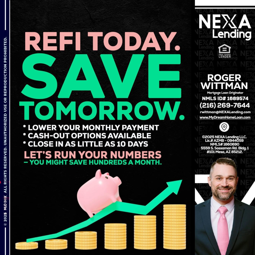 Hi, my name is Roger Wittman. I’m a Loan Officer with NEXA Mortgage LLC., offering personalized mortgage solutions, fast customized quotes, great rates and service with integrity.