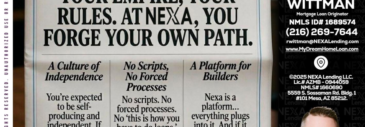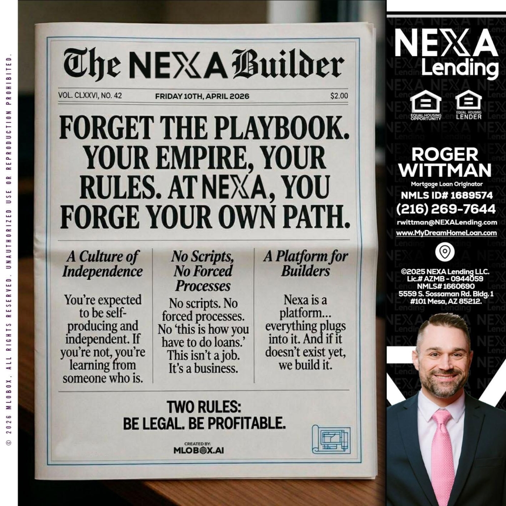 Hi, my name is Roger Wittman. I’m a Loan Officer with NEXA Lending LLC., offering personalized mortgage solutions, fast customized quotes, great rates and service with integrity.