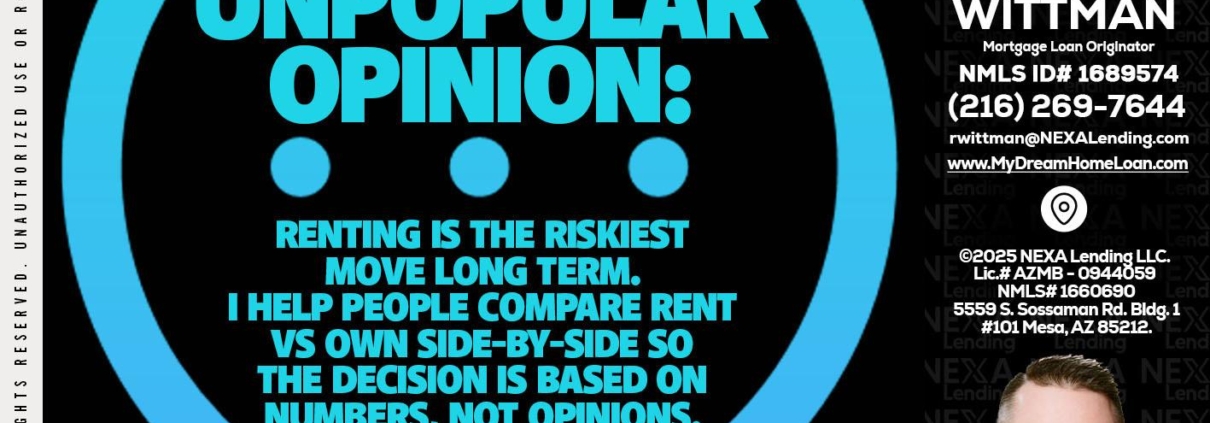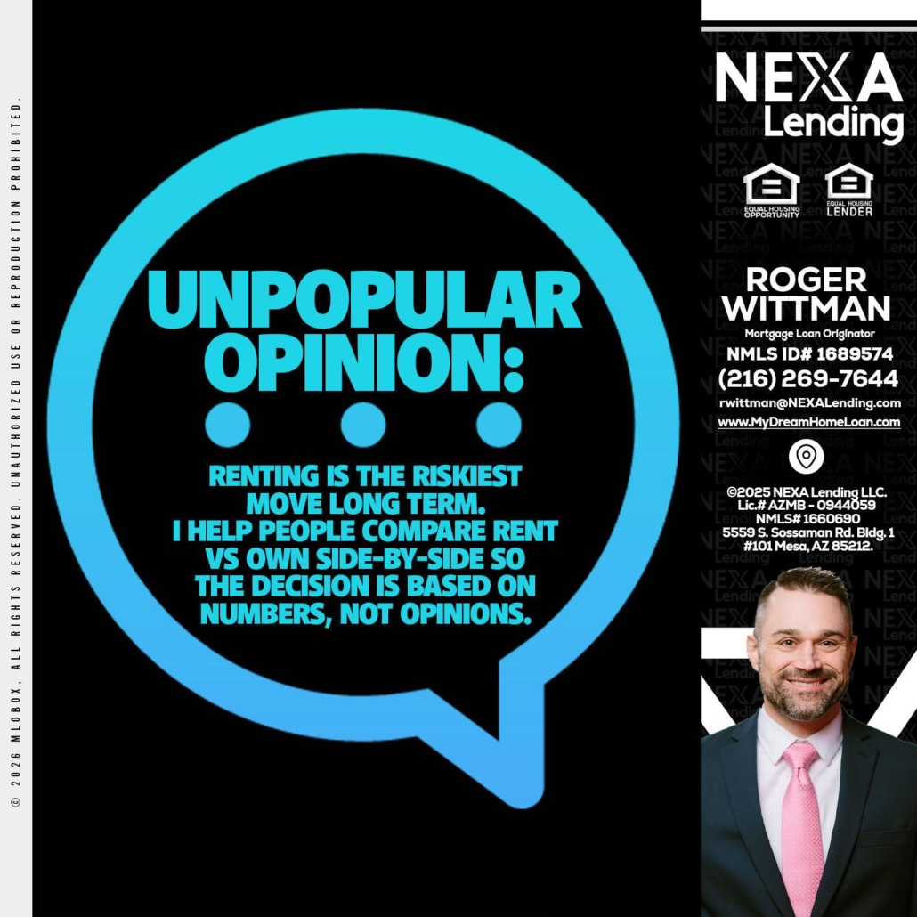unpopular opinion - Roger Wittman -Mortgage Loan OriginatorHi, my name is Roger Wittman. I’m a Loan Officer with NEXA Lending LLC., offering personalized mortgage solutions, fast customized quotes, great rates and service with integrity.
