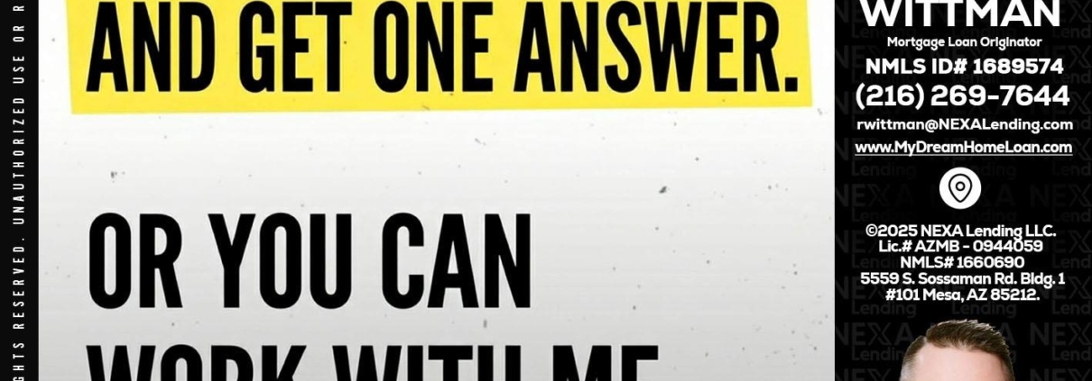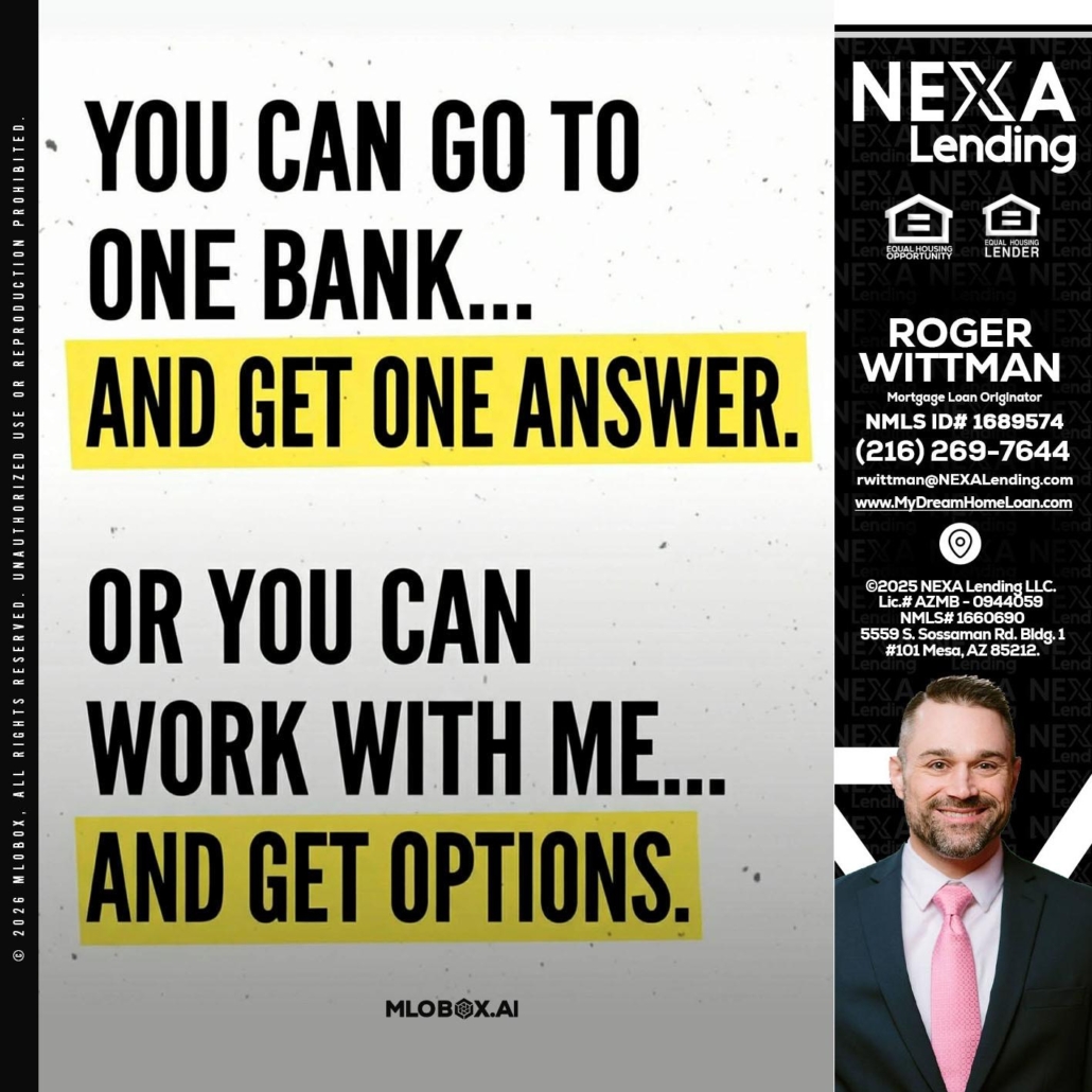 Hi, my name is Roger Wittman. I’m a Loan Officer with NEXA Lending LLC., offering personalized mortgage solutions, fast customized quotes, great rates and service with integrity.